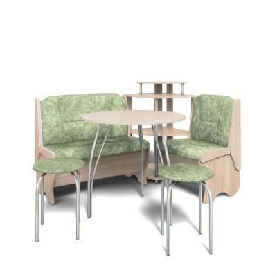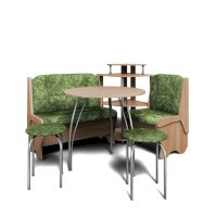 Оригинальный кухонный уголок Лотос отличается от других похожих кухонных гарнитуров. Он состоит из двух отдельных диванчиков и этажерки, заменяющей угловую мягкую часть. Круглый кухонный стол в отличие от других наборов мебели на металлическом основании как и два круглых табурета. Набор мебели для кухни включающий в себя большую прямую скамью,малую прямую скамью,угловую этажерку, стол на металлических ногах и два табурета на металлокаркасе. В прямых скамьях под сиденьями расположены ящики.