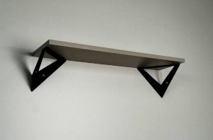 Полка крепится к стене с помощью чёрных треугольных держателей, которые обеспечивают устойчивость и долговечность. Особенность модели в том, что держатели можно расположить сверху, снизу или один сверху, другой снизу, что позволяет адаптировать полку под любые интерьерные решения и потребности.
